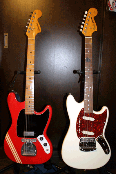 ギターの改造を行っておりました。 今はもう無い、Fresher というメーカーの Mustang コピーモデルです テスコやグヤトーンなんかのビザールギターの時代から、 トーカイ、グレコのジャパンビンテージ時代へ移る、ちょうど 過渡期の製品ではないでしょうか。 フェンダームスタングのコピーなのですが、どこと無くビザールギターの ような胡散臭さが漂う独特の雰囲気。 ピックアップは金属カバー付きのシングルコイルで、結構幅がある見たことの ないタイプ。コントロール部は金属プレートではなく、なんと白いプラ製! ネックは結構ボディよりについていてハイフレットが弾きにくい。 しかもムダに貼りメイプルの指板。 設計した人は確実に実物を見たこと無かったのでしょう。 2・3年ほど前にヤフオクで入手したのですが、前オーナーにより 改造されていました(元のパーツも付いてきましたが)。 少しでもフェンダーのデザインに近づけようとしたのか、 ピックガードは白いものに、コントロールが付くパネルは 金属プレートに換えられていました。 しかしギター自体の個性を活かした方が良いと思い、あえてオリジナルの外観を 尊重する方向で、そして自分好みの音が出せるように改造することにしました! コントロール部はオリジナルの白いプラ製のものに戻し、 ピックガードもオリジナルのイメージで黒のものを自作。 ピックアップはダンカンのミニハムを採用。 コンデンサーはオレンジドロップに交換しています。 ペグも新品に交換しましたfチューナーがやっぱかっこええと思うのですが、 フェンダーのだとなんか違う!と思ってあえてフェルナンデスの fチューナーをつけました。Fが大文字で角ばってます。 じつはこの改造、だいぶ前にやりかけて途中で放置していたもので (ずっと仕事が忙しかったからね~泣)、今回やったのは自作ピックガードの 仕上げとペグの交換部分です。 ピックガードにピックアップ取り付け部分の穴を空けたのですが、 この間落札した電動糸ノコが大活躍!ラクチンラクチン!! 形を出すときはまだ糸ノコなかったのでドリルを使って切り出し (切手の切れ目みたいな感じ)、棒ヤスリで整えたのですが、 ヤスリがけ超大変だった!このやり方は二度とやらない。 先月落札したフェンジャパのMG65とツーショット。これもそのうち改造するつもり。 P90載せたいけどダンカンのシングルサイズのハムとか、レースセンサーの バーガンディーも気になってます。 しかし、改造するのはしばらく先になるけどね~。 工作はしばらくお休みして、曲作りとかを優先しようと思ってます。 ついでに69年製コンペティションオレンジと65年製(たぶん)のムスタングベース。 こいつらは本物です。けっしてBeckモデルじゃありませんっ。 コンペティションは一応おいらのメインギター。最近ジュニアの使用が多いけど。 リアにP90のせてますが、改造はお店でやってもらいました。 っていうか、どんだけムスタング好きやねん! PR